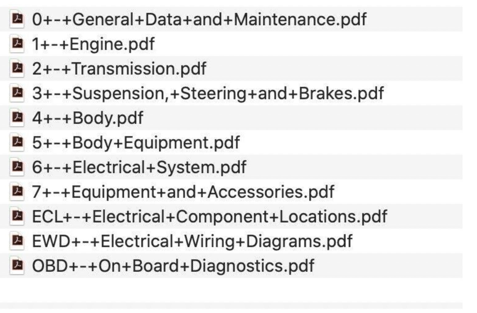 Il manuale comprende: Maintenance - Engine - Electrical - Body - Equipment - Transmission - Suspension - Brake - Steering… See image of index for detailed list |