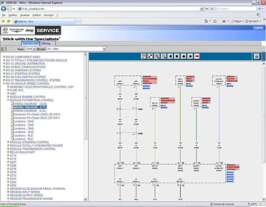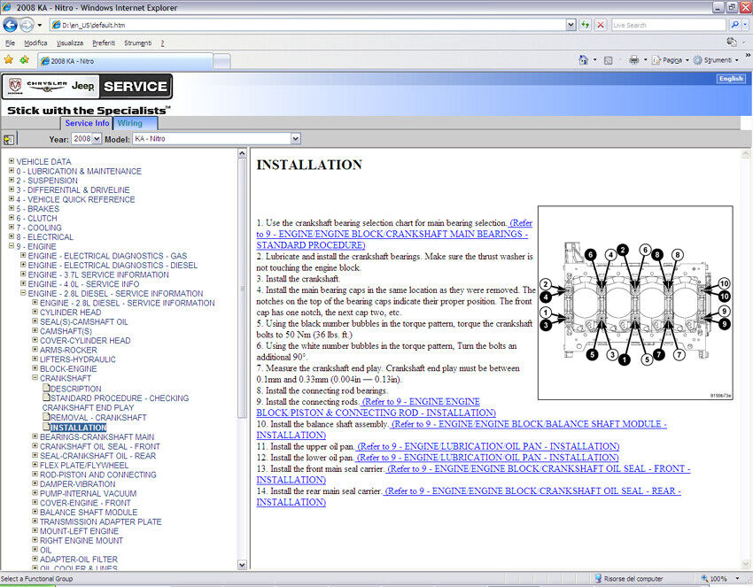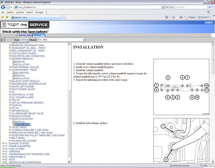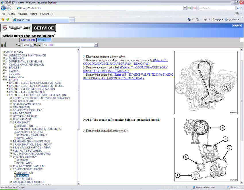 Modelli trattati – Models covered Dodge Nitro (KA) 2007-2011 (*) Motori/Engines: 3.7L - 4.0L - 2.8 Diesel (*)Dvd contains also manual for: Chrysler PT Cruiser (PT) - Dodge Nitro (KA) - Dodge Caliber (PA) - Chrysler Sebring (JS) - Chrysler Voyager (RT) - Chrysler 300 - Dodge RAM (DR-DH-D1) - Dodge Charger (LX) - Dodge Magnum (LX) - Dodge Durango/Aspen (HB-HG) - Jeep Grand Cherokee (WH) - Chrysler Crossfire - Jeep Wrangler (JK) - Jeep commander (XH) - Jeep Compass/Patriot (MK) |